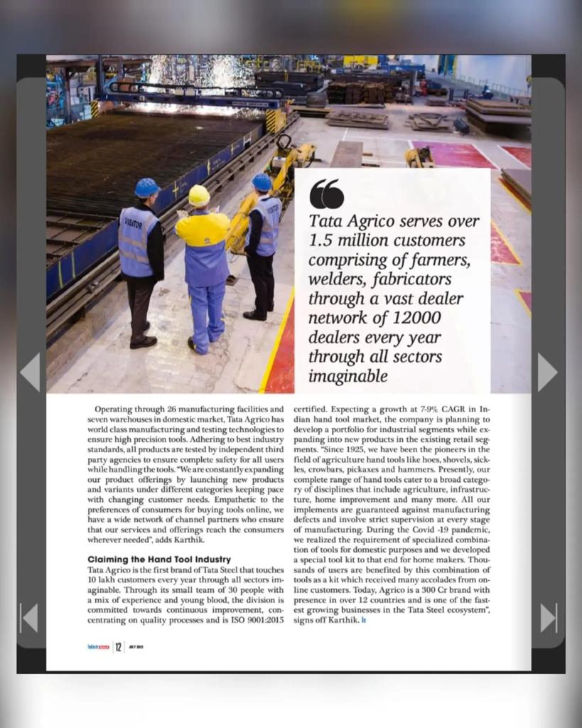 There are increasingly more industrial applications for hand and power tools, such as automotive maintenance and repair. A new generation of production technologies has led to the advancement of these tools to unprecedented levels. For over a century, Tata Steel’s oldest brand, Tata Agrico, has provided one-stop solutions for farmers, carpenters, mechanics, plumbers, agricultural cooperative societies, railways, defence services, collieries, and Central and various state governments. With a wide selection of alloy steel high-value trade hand tools, Tata Agrico caters to both home improvement enthusiasts and professional tradesmen, offering combination spanners, combination pliers, adjustable wrenches, allen keys, files, sockets, screwdrivers, ball peen hammers, tool kits and warranty against manufacturing defects.