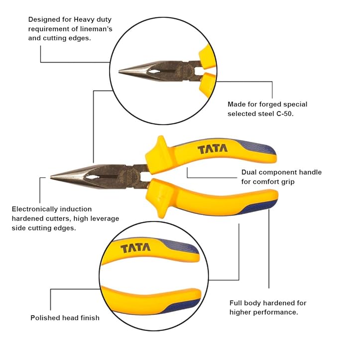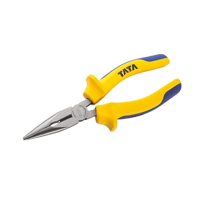 The Tata Agrico long nose pliers are sturdy and hardened for durability. The long nose pliers have a polished head and are constructed from anti-rust chrome vanadium steel. The jaws and cutting edge are also hardened and tempered. These long nose pliers have dual component handles for a comfortable grip.