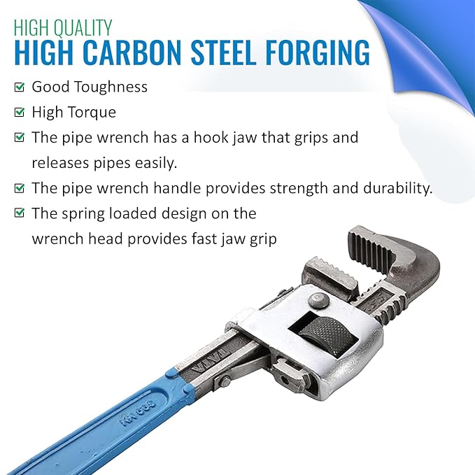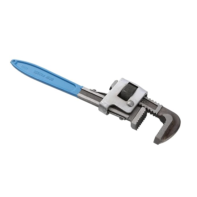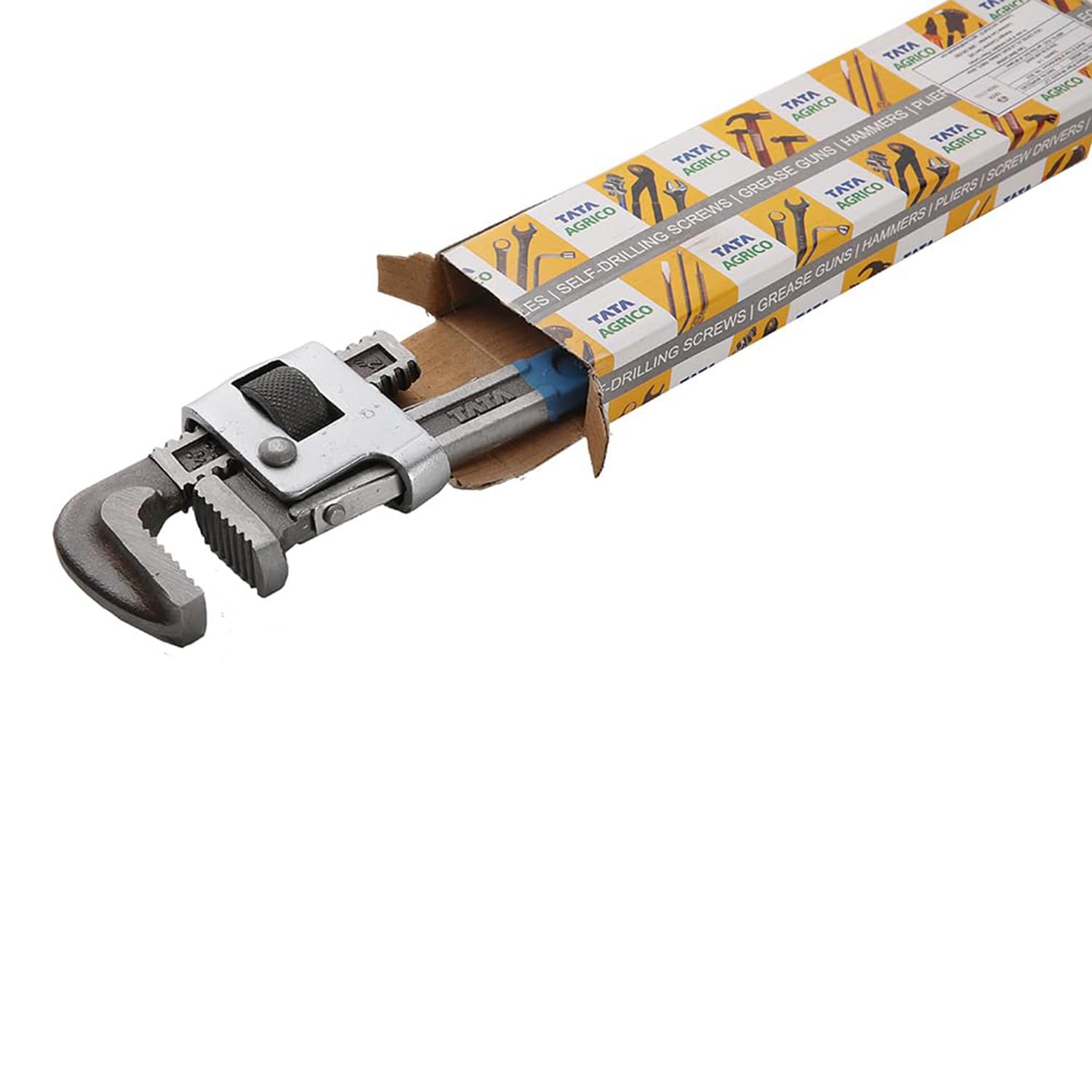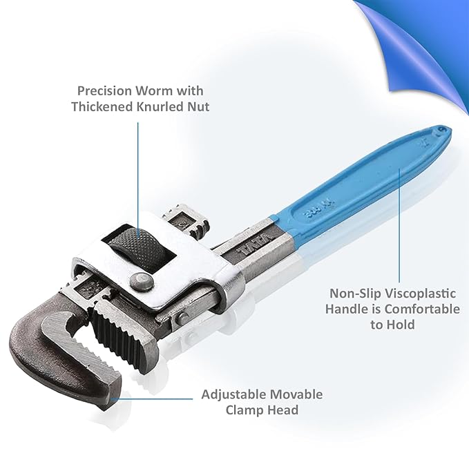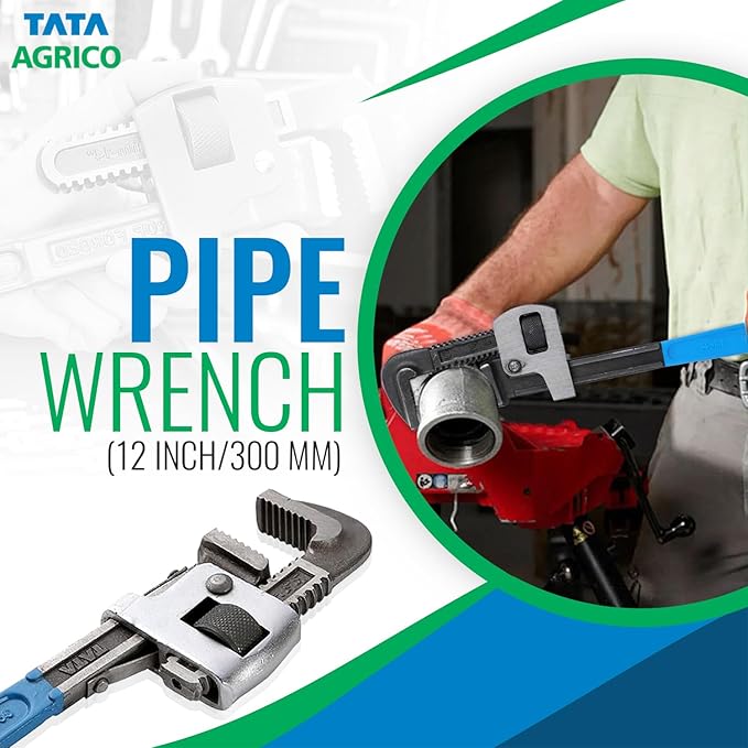The material used to make the Tata Agrico Stillson pipe wrench is chrome vanadium steel. It fits round surfaces and is used to hold and turn iron pipes. The jaw’s movable construction makes it possible to lock the frame in place. The teeth are shaped to provide improved grip while working.